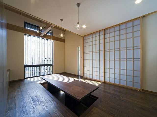 堀座卓のある大空間リビングでは家族や友人が集まりホームパーティーやホームシアターが楽しめ、常に笑い声が聞こえてきそうです。